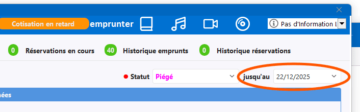+ d'informations : Cette fonctionnalité est applicable aux cotisations, aux pénalités, ou tout autre flux financier, y compris les tickets d'historique .Elle est accessible depuis l'onglet cotisation de la fiche lecteur.